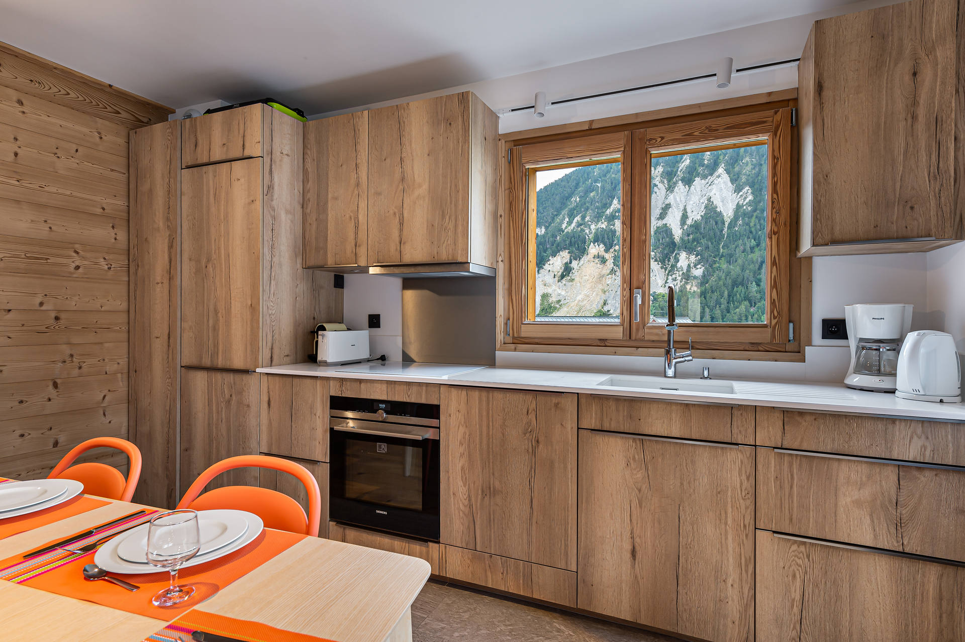 - Cuisine ouverte entièrement équipée : Frigo-congélateur, four, hotte, plaques induction, cafetière filtre et Nespresso,appareil à raclette, plancha, grille pain, bouilloire, micro-onde, lave vaisselle...