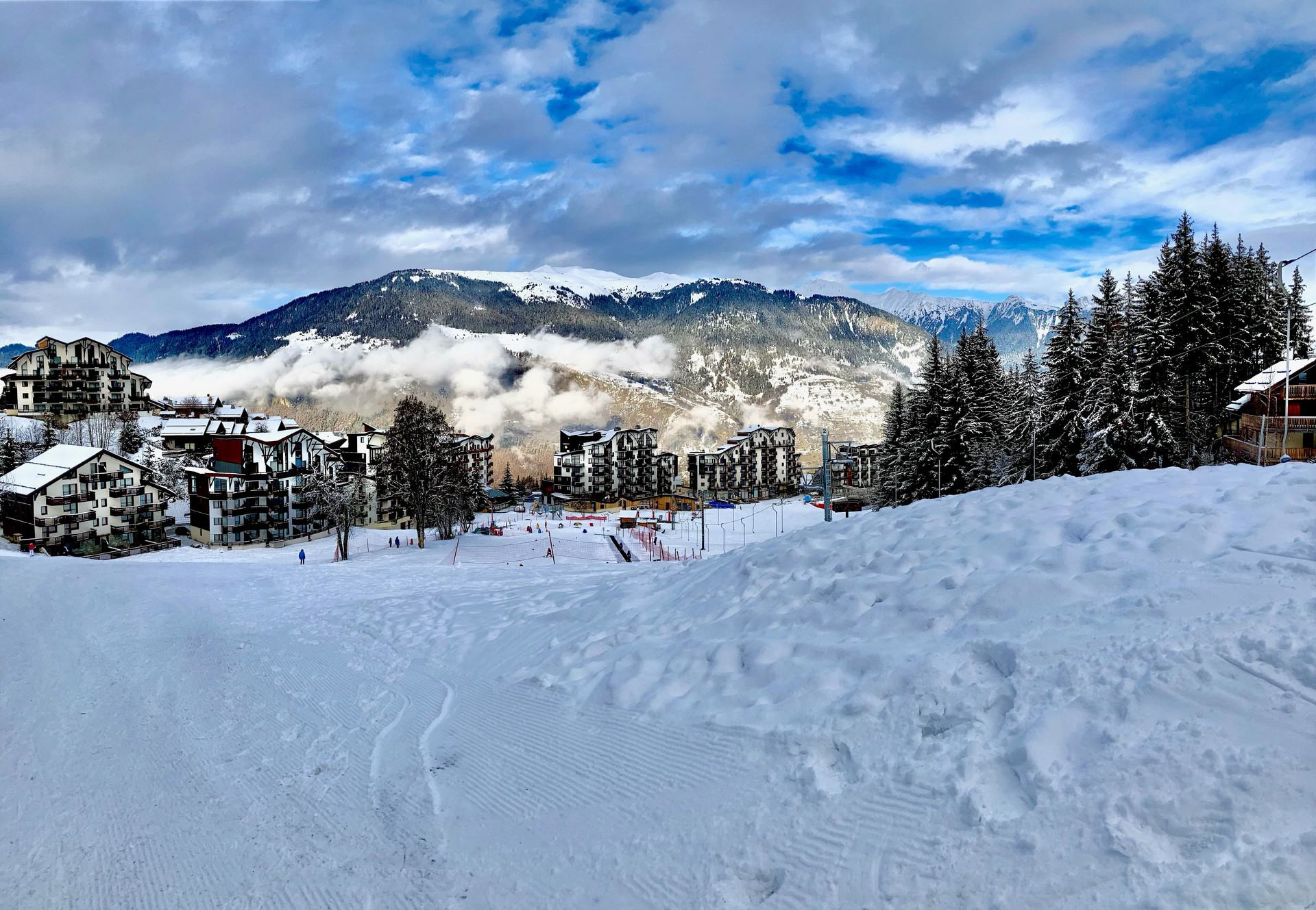 Balcon exposé Sud avec vue sur la piste et la forêt.