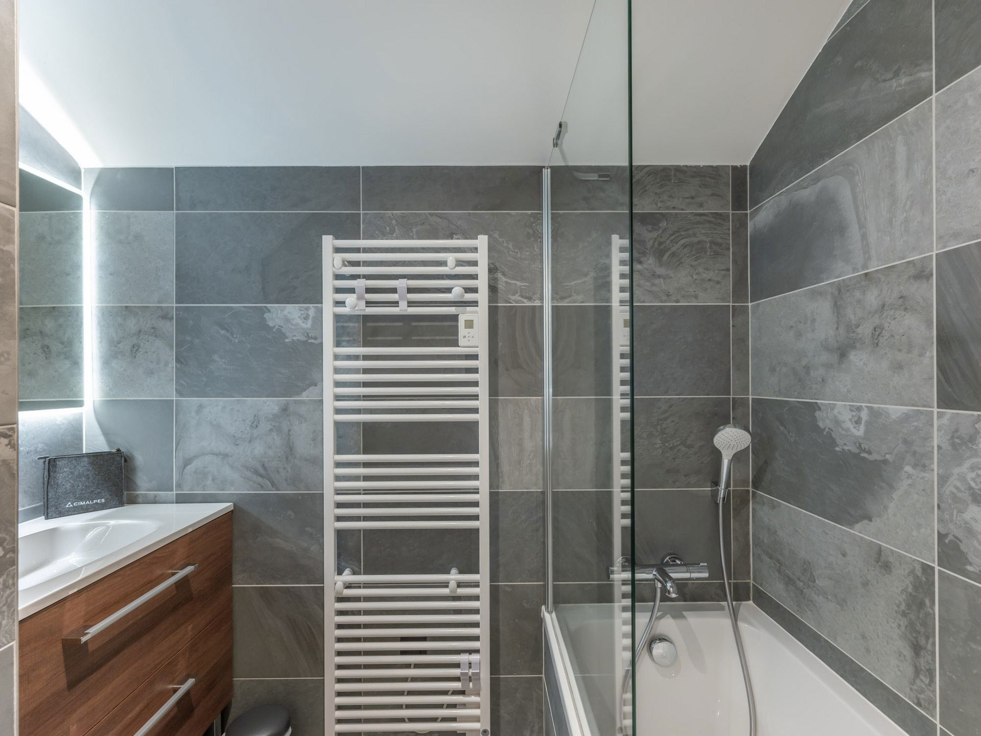 - Salle de bain indépendante avec baignoire, simple vasque et sèche-serviettes