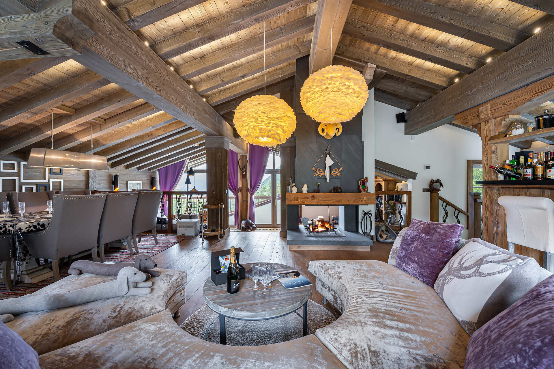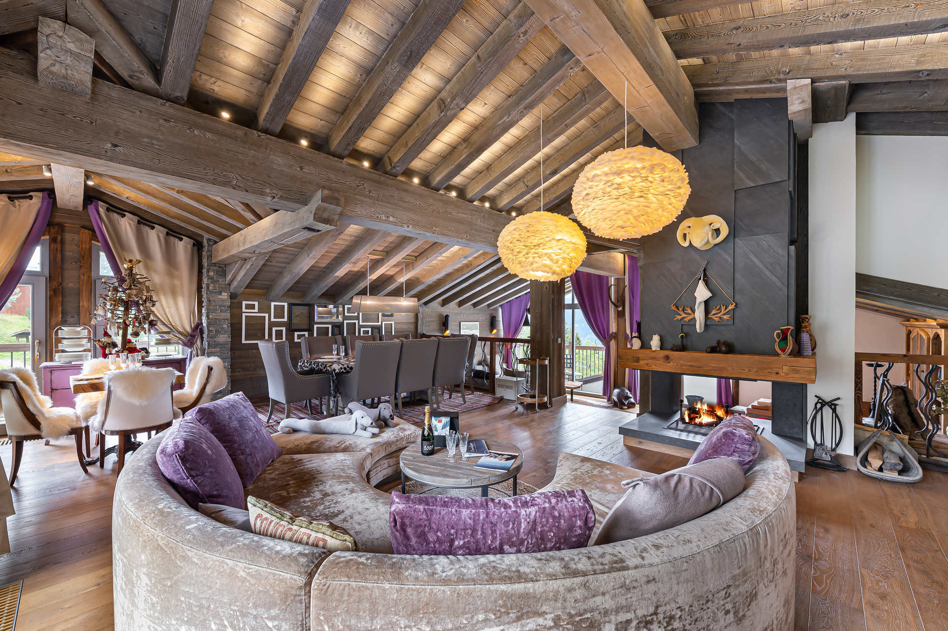 - Salon et salle à manger, avec un espace canapé cheminée